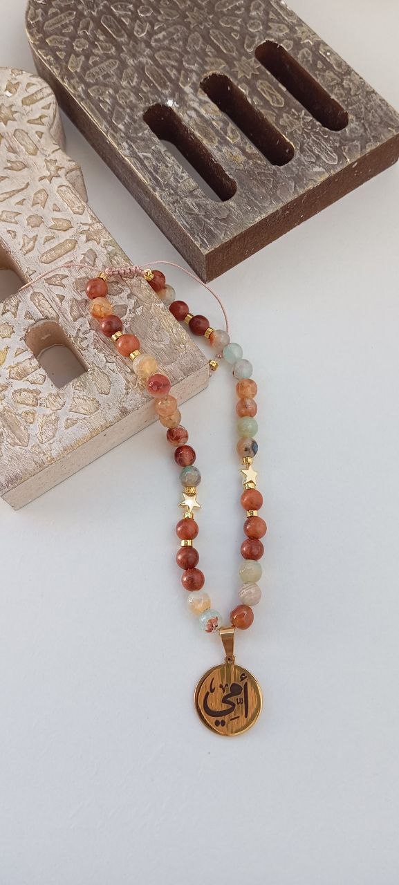 سبحه 33 من حجر عقيق وخشب كوك ودلايه ستانلس وتتلبس انسيال ويمكن كتابه اى اسم